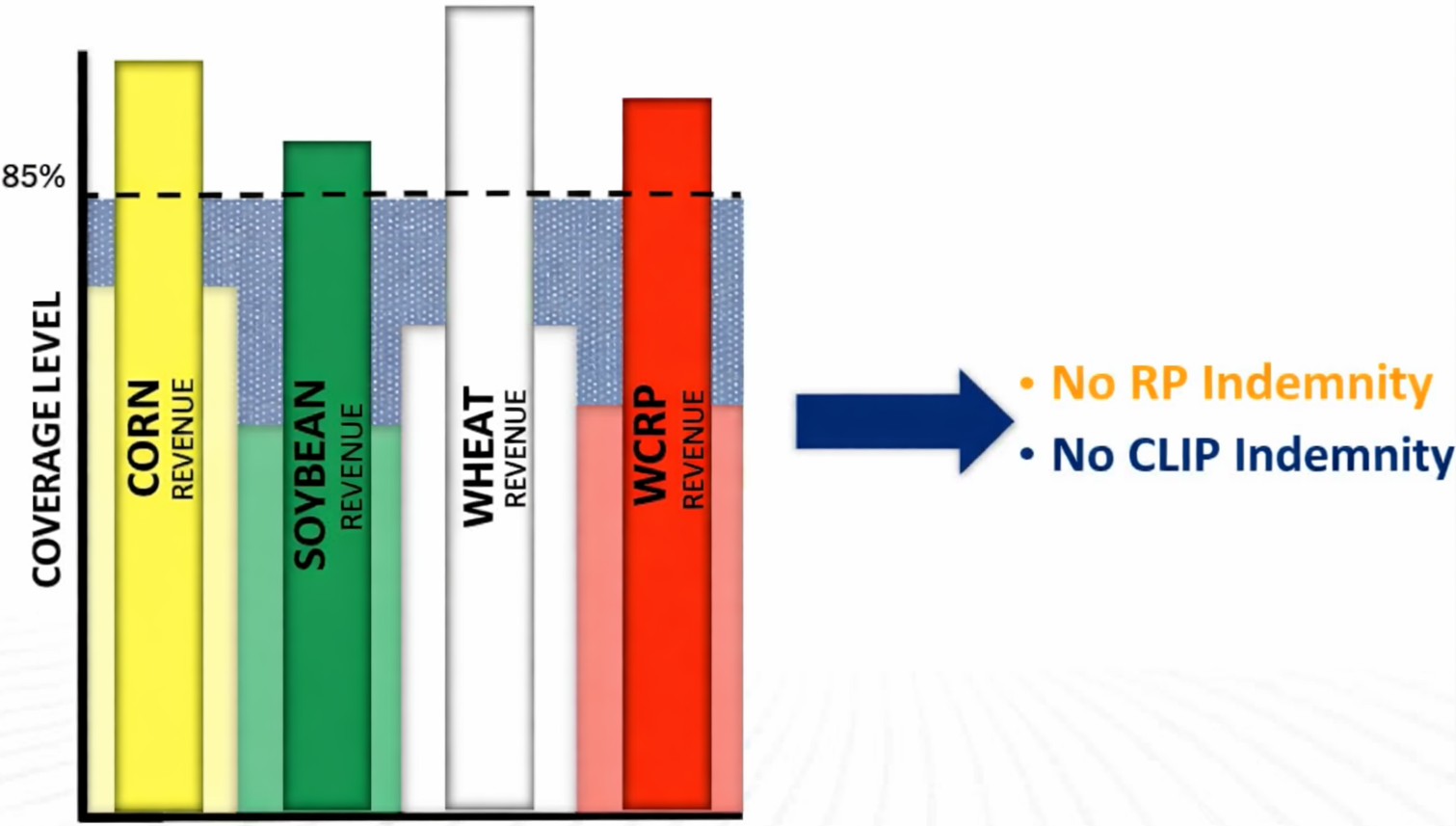 At a high level, this is an umbrella policy that sits atop underlying Revenue Protection (RP) crop insurance policies and covers the revenue “gap” between RP up to the 85% level we often don’t cover due to cost. One of our partner companies, Rain & Hail, had some good graphics to illustrate: