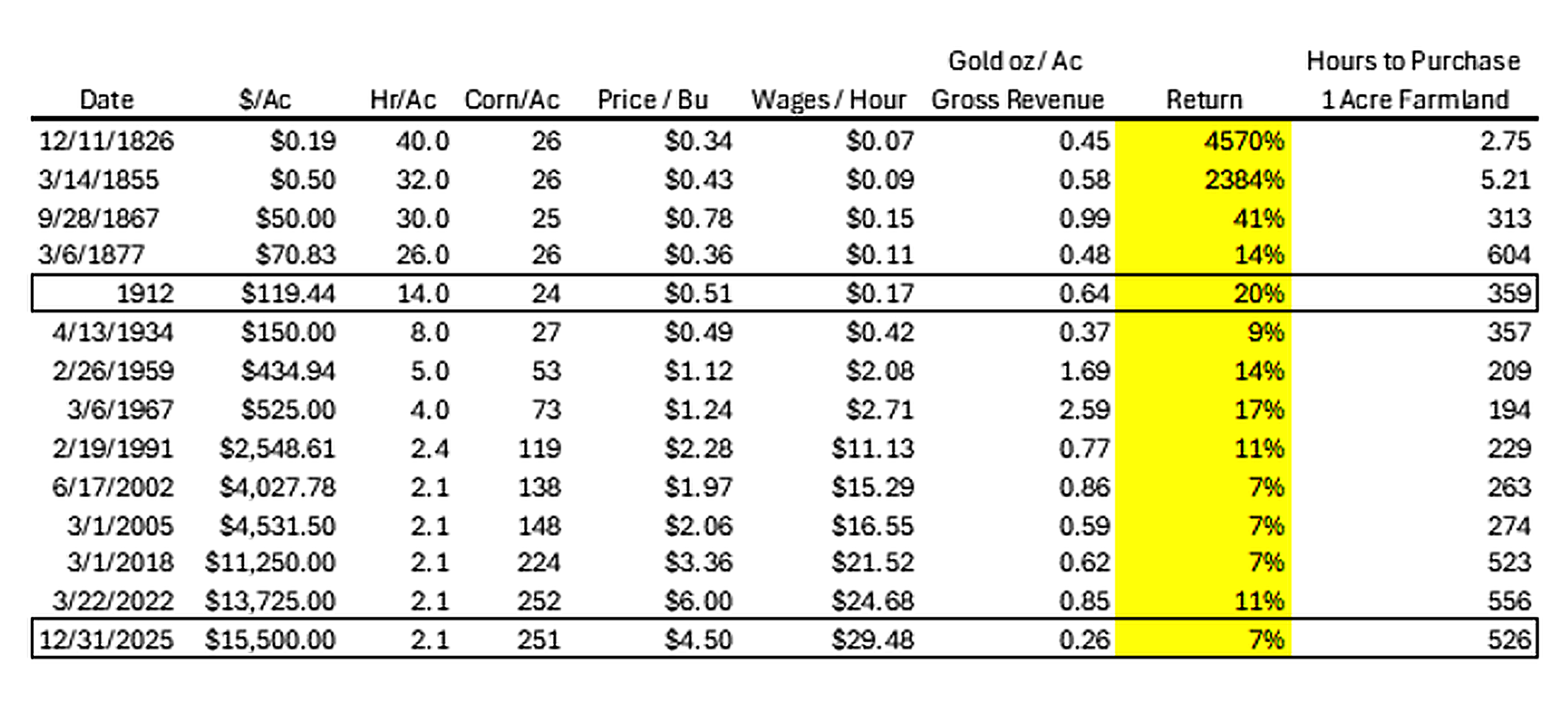 To make meaningful comparisons, I adjusted for inflation using gold as a proxy, analyzed average corn yields, price per bushel, labor hours per acre, and hourly labor value.